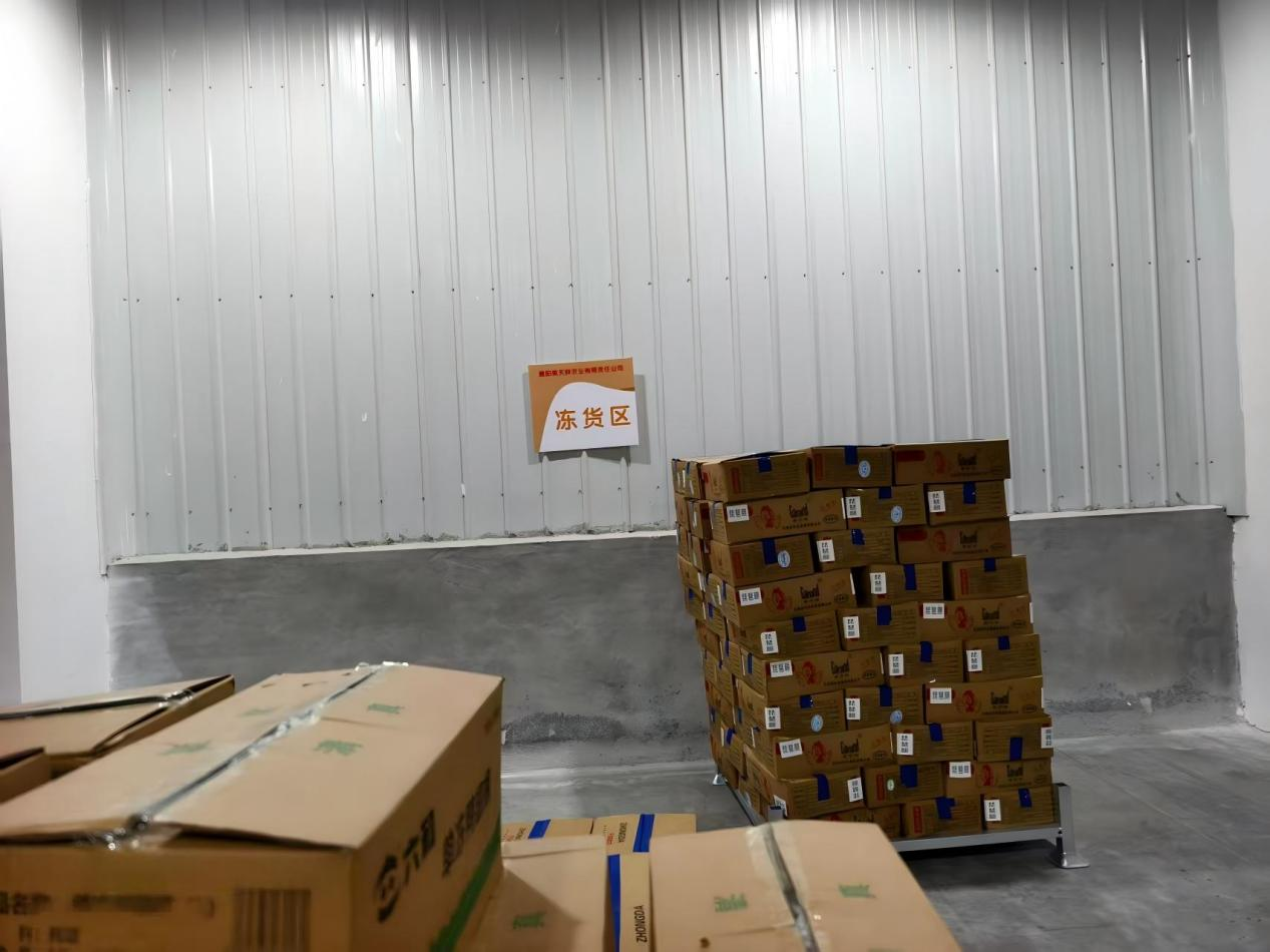 该区域为襄阳美天鲜农业有限责任公司的冻货区,是企业生鲜供应链中冷冻食材的核心仓储枢纽,与蔬菜冷藏库、干货调料区、肉类区、检验室、配送区共同构成完整的全品类食材供应闭环。